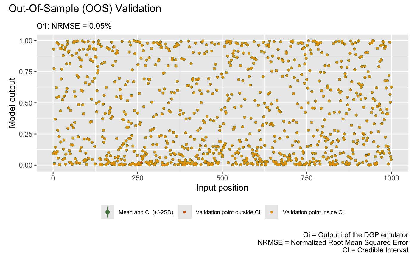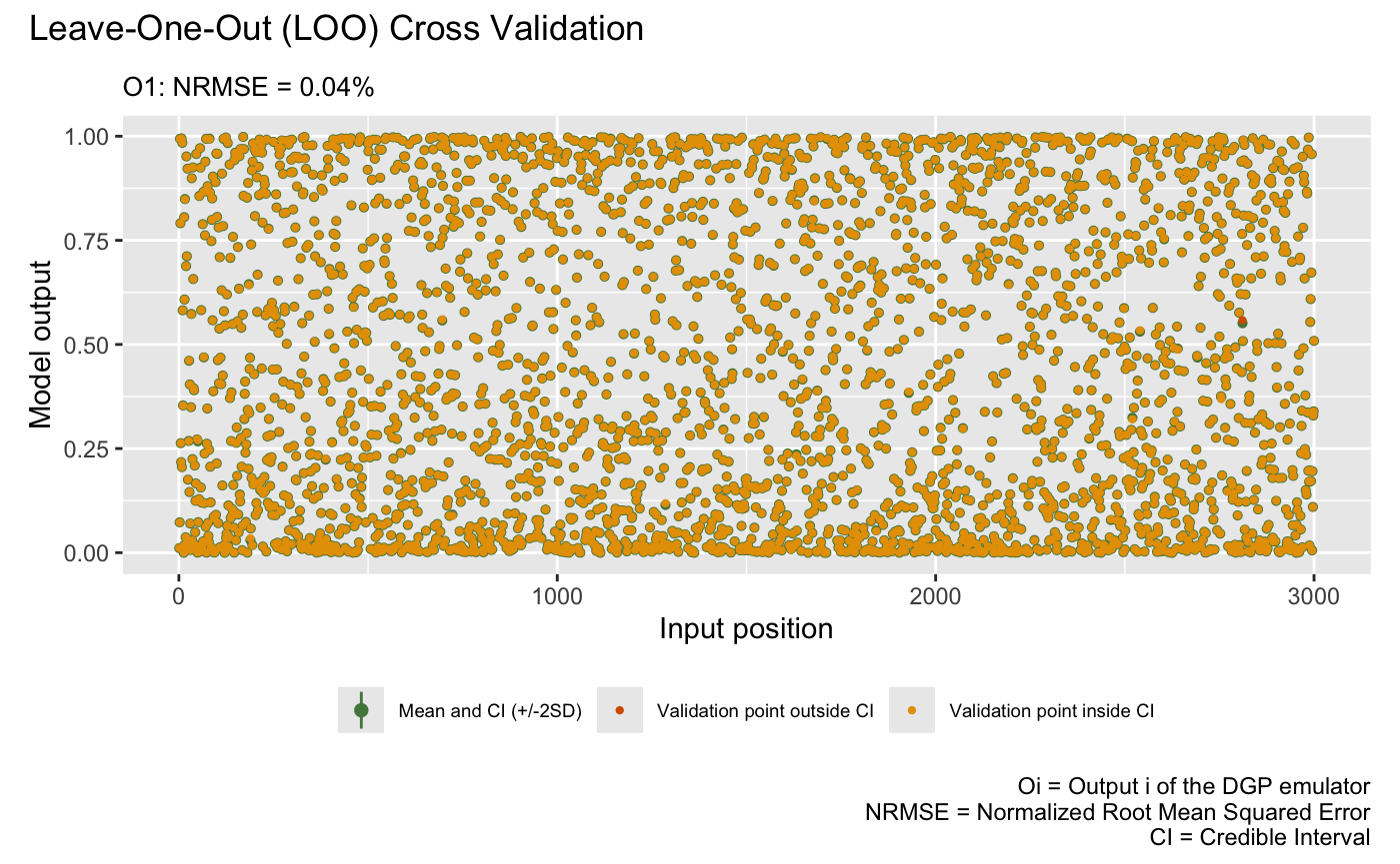 After we have the emulator, we can validate it by the Leave-One-Out (LOO) cross validation plot: