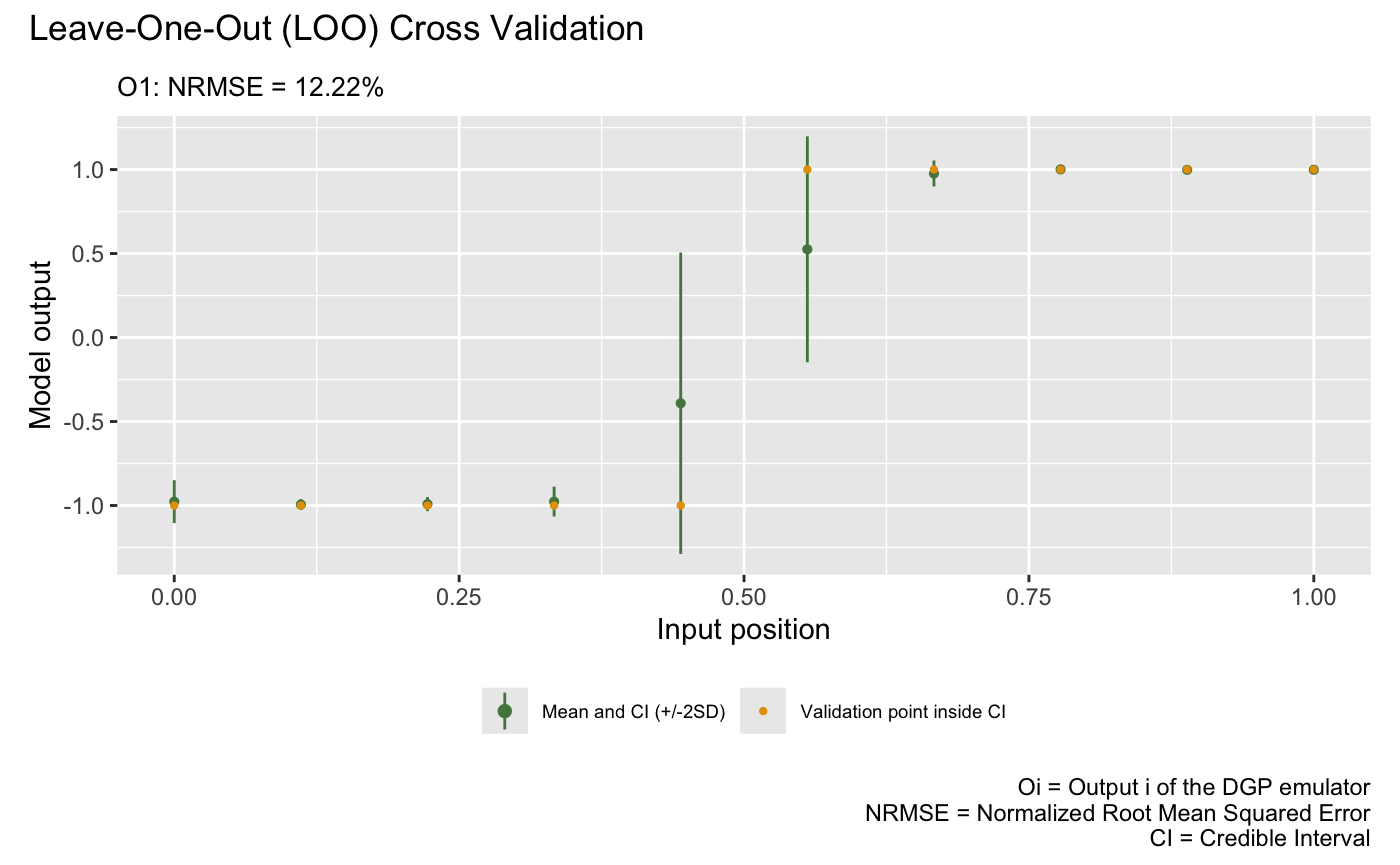 After we have the emulator, we can validate it by drawing the validation plots. There are two types of validation plots provided by the package. The first one is the Leave-One-Out (LOO) cross validation plot: